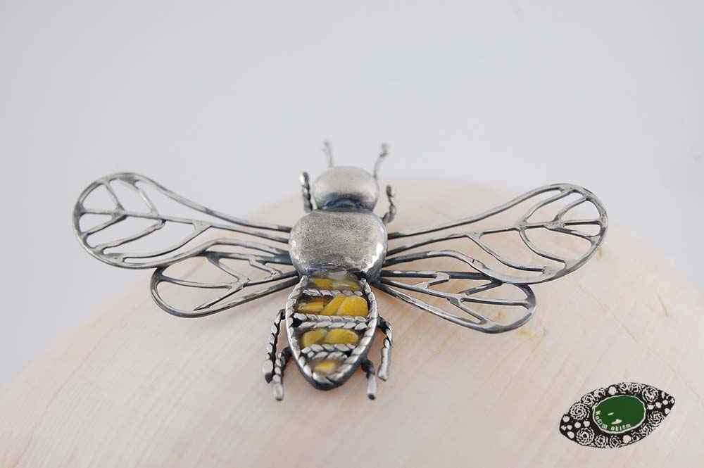 insekty mnie zafascynowały. teraz pszczoła - zawieszka. wielka, solidna, srebrna pszczoła. ozdobiona mozaiką z korala zatopionego w żywicy UV. całość jest oksydowana, skrzydła wypolerowane na połysk, a tułów na mat.